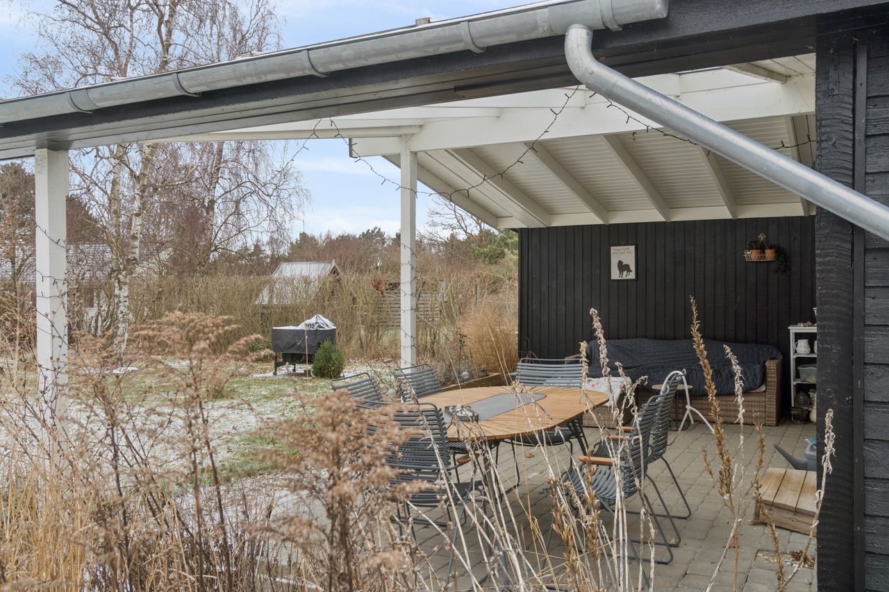 Fra stuen er der direkte udgang til en overdækket terrasse med ovenlys vinduer i den ene side, så der kommer et dejligt lys ind mens du stadig er beskyttet for regn og blæst. Dette er i sommerhalvåret et ekstra opholdsrum og skaber en naturlig overgang mellem inde- og udeliv.