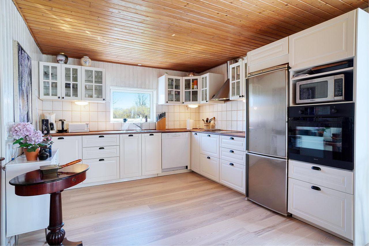 Køkken-alrummet er i vinkel med ny brændeovn, og det flotte hvide køkken med mange skabe og