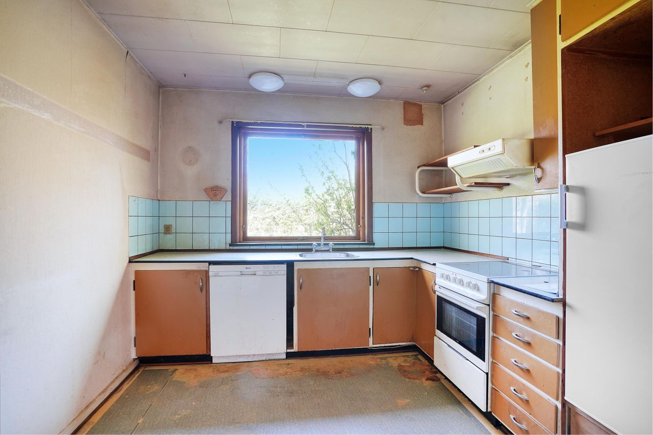 oprindelige 60´er køkken. 4 værelser, fordelingsgang, stort disponibelt rum, værksted, garage, toilet m.
