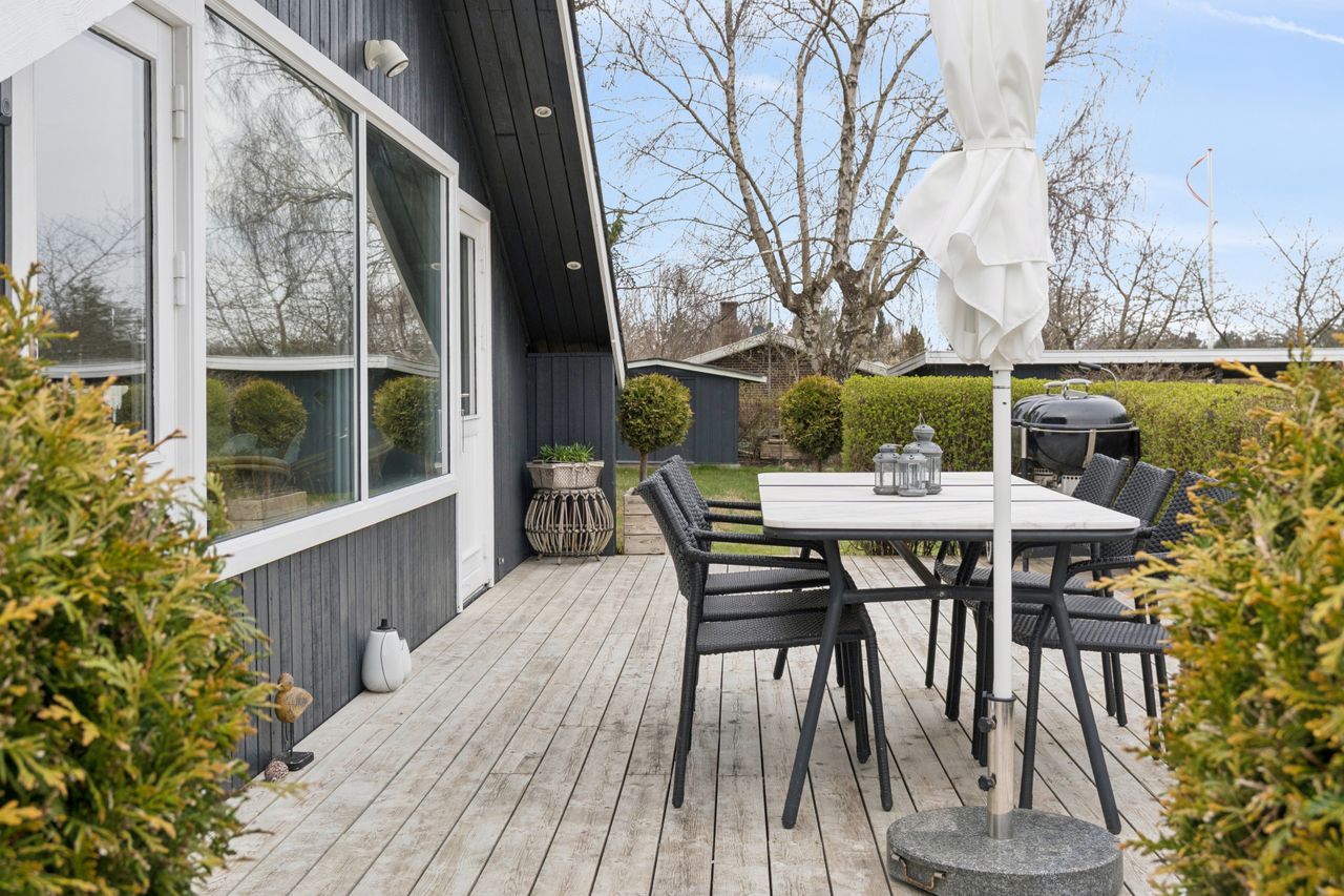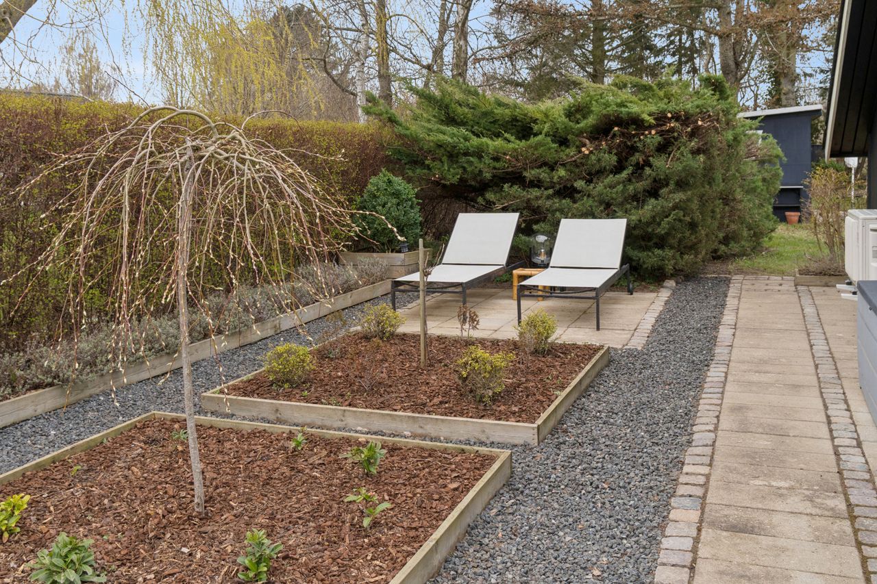 Her er flere terrasser og en skøn og velanlagt have med masser af læ kroge, overdækninger, bålsted og vildt voksende blomster efter ”Vild med Vilje” princippet, og et par højbede, alt omkranset af en høj hæk, så du er rimelig ugenert.